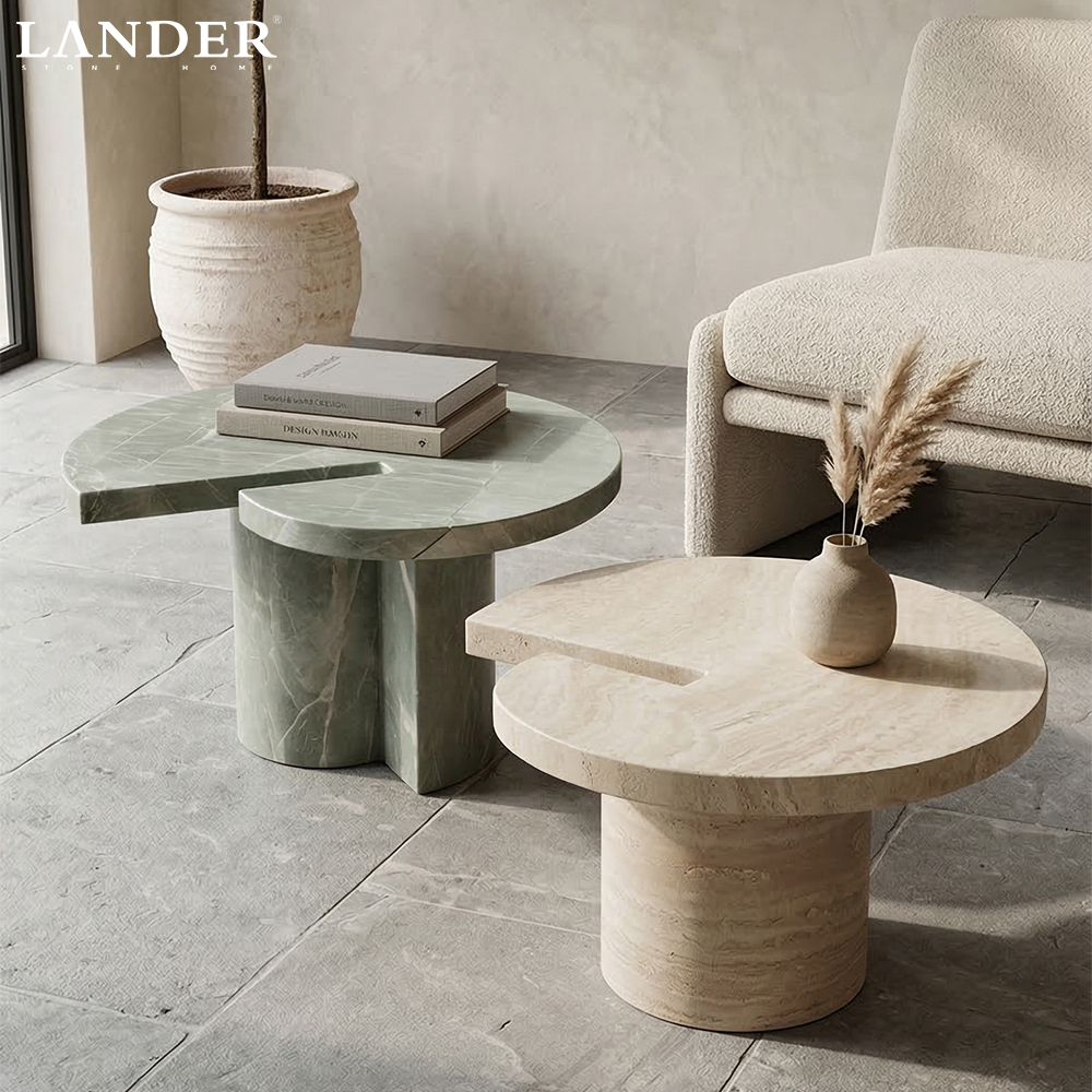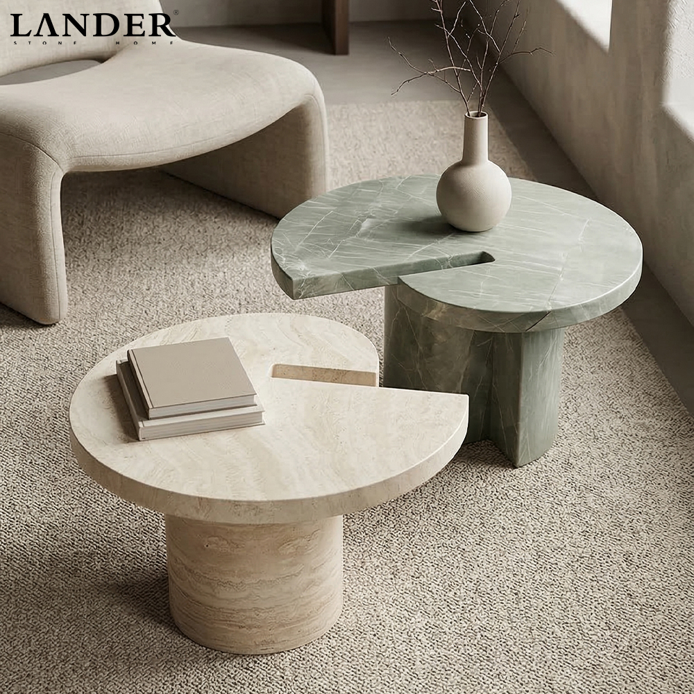The Travertine and Green Marble Side Table Set is a sophisticated, modular pairing designed to add sculptural elegance to modern interiors. This nesting set features two distinct yet complementary tables, each crafted with a rounded top and a substantial cylindrical base. The first is crafted from warm, textured Travertine, while the second uses a cool, smooth Green Marble (likely a serene grey-green tone). The tops feature a distinctive C-cutout, allowing the tables to be arranged in a creative, interlocking configuration or used separately as standalone accent pieces. Ideal as side tables or sculptural pedestals, this premium set masterfully combines contrasting textures and colors for a contemporary, high-design statement.