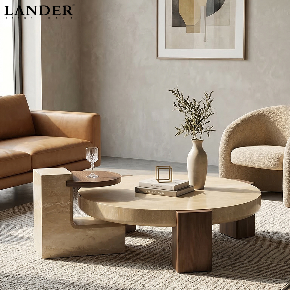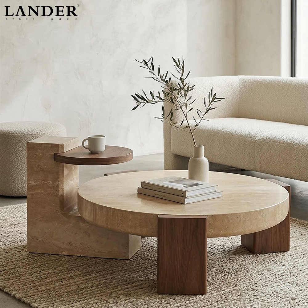 Natural Contrast: Genuine travertine paired with a solid wood base brings warm, organic texture and a refined, modern-organic look.