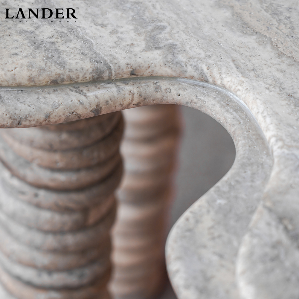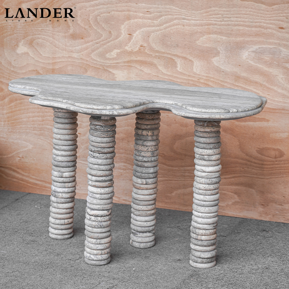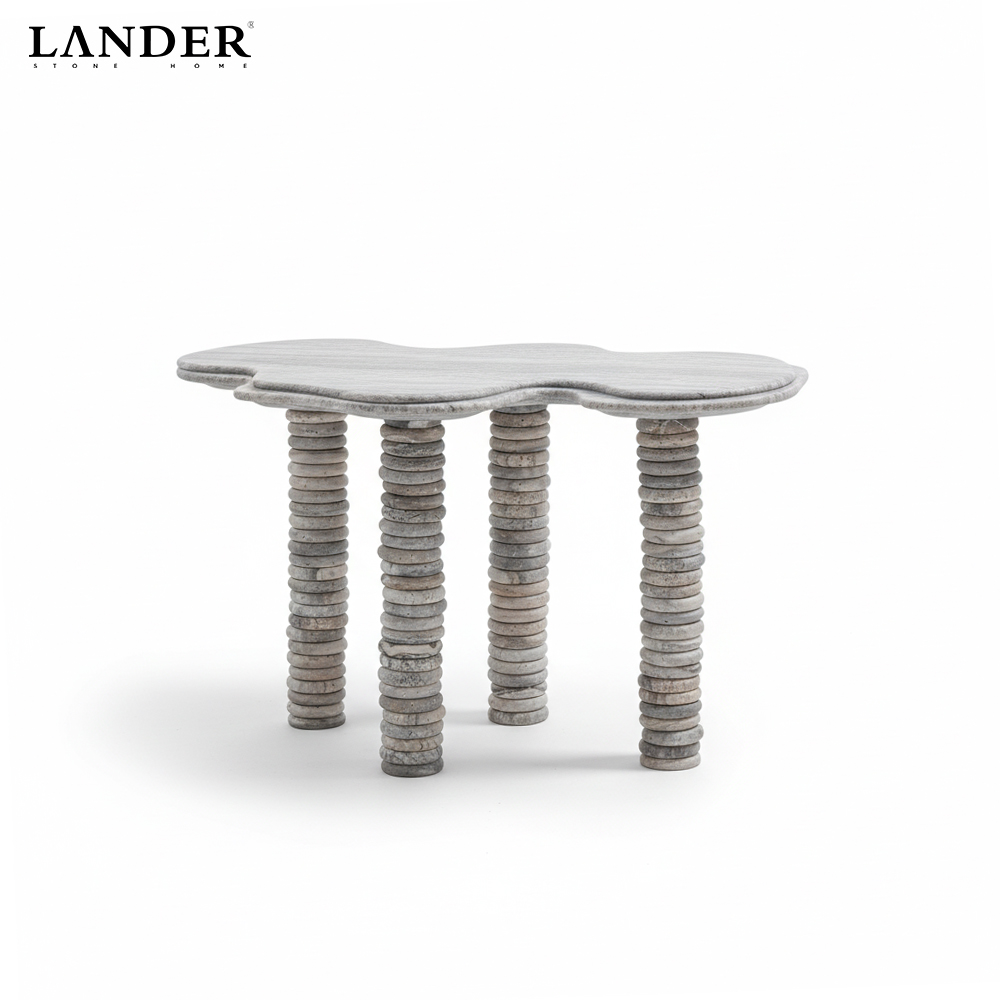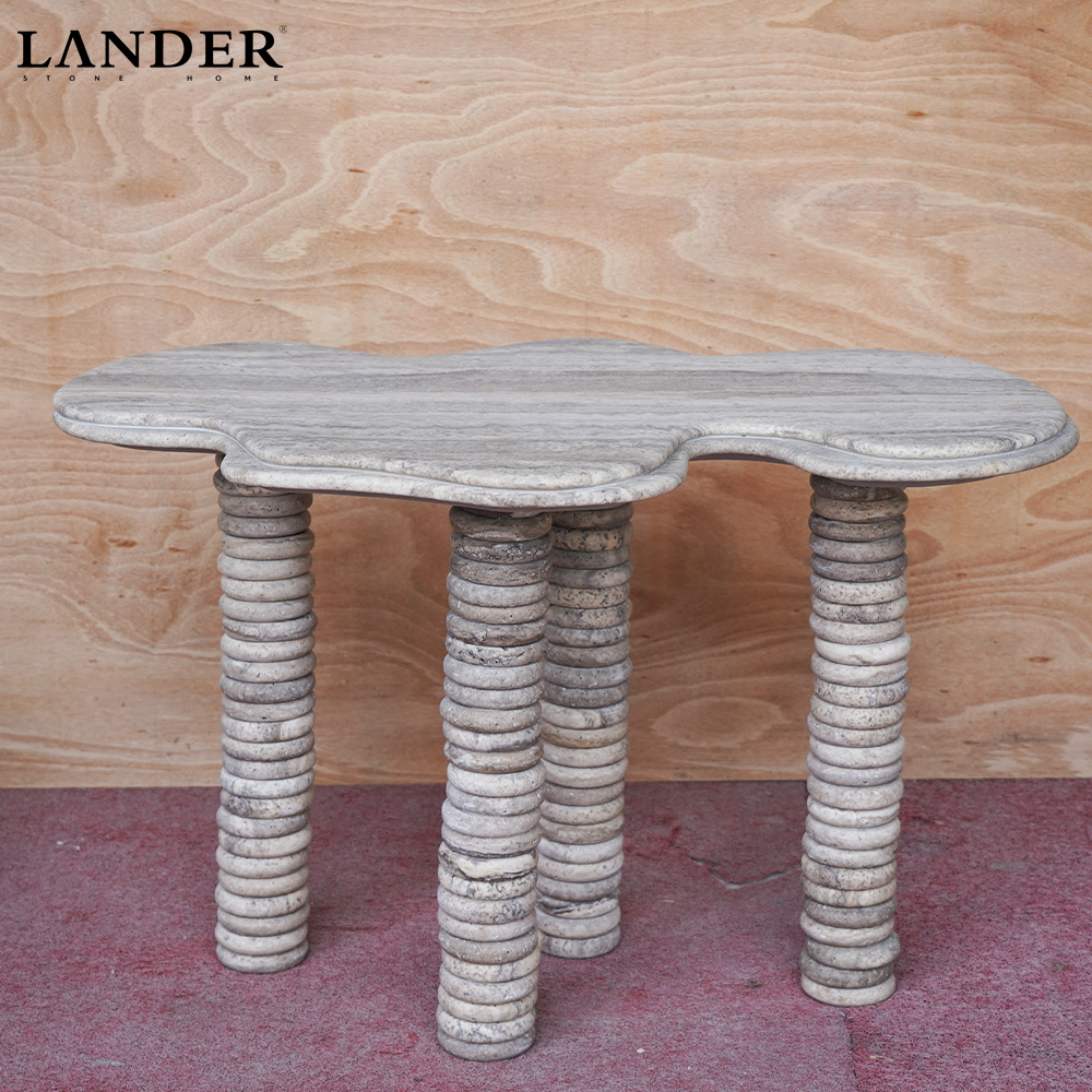 The Travertine Marble Small Round Stacked High Table is a highly sculptural piece that transforms natural stone into architectural artistry. This table features a charming small, scalloped (or flower-shaped) round top crafted from porous, warm Travertine Marble. The most distinctive feature is the table base, which is composed of stacked, smooth stone discs forming tall, slender legs that provide a striking textural contrast to the smooth top. Perfect as an eye-catching accent table, a stylish pedestal for displaying art, or a high side table, this piece introduces elegant texture, visual lightness, and timeless natural beauty to contemporary interiors.