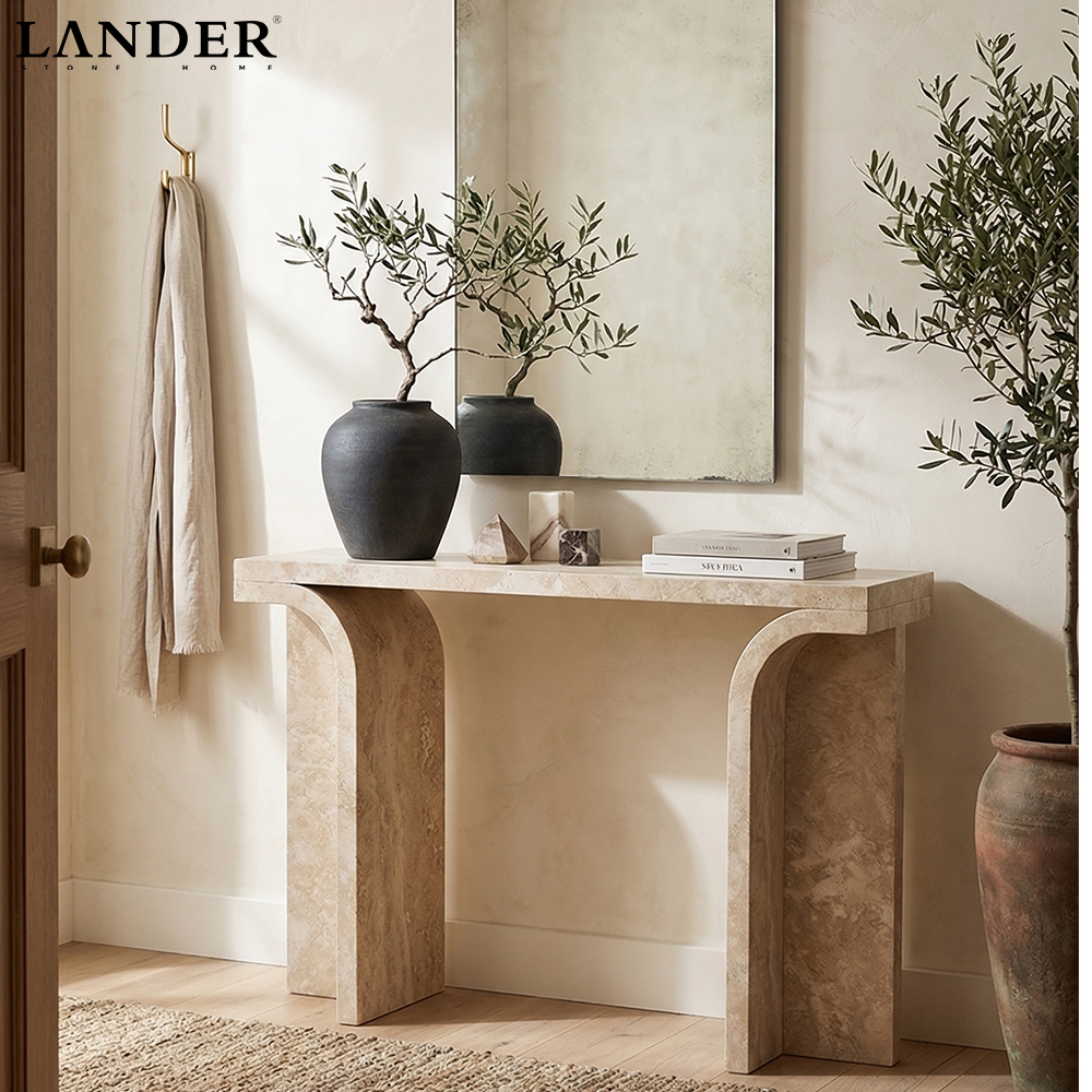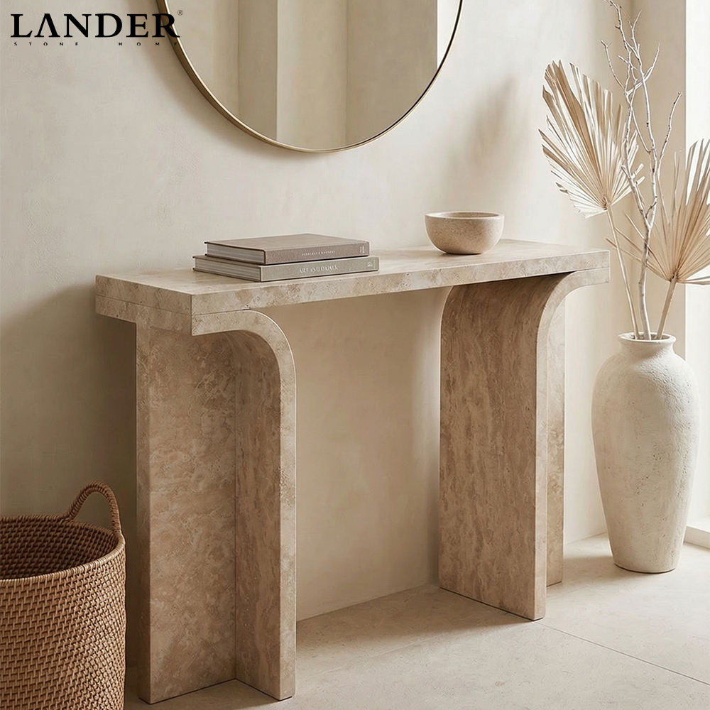 The Travertine Marble Console Table New Design is a stunning exploration of negative space and fluid stone craftsmanship. Expertly carved from premium Beige Travertine, this console features a sleek, linear top that appears to float atop two innovative C-curved slab legs, creating an airy yet monumental silhouette. The design highlights the stone’s organic soul, showcasing a warm palette of sandy tones and the characteristic porous textures that make each piece a singular work of natural art. With its seamless blend of architectural precision and raw material beauty, this table is a perfect statement piece for minimalist entryways, sophisticated hallway galleries, or high-end contemporary living spaces seeking a touch of Mediterranean-inspired modernism.