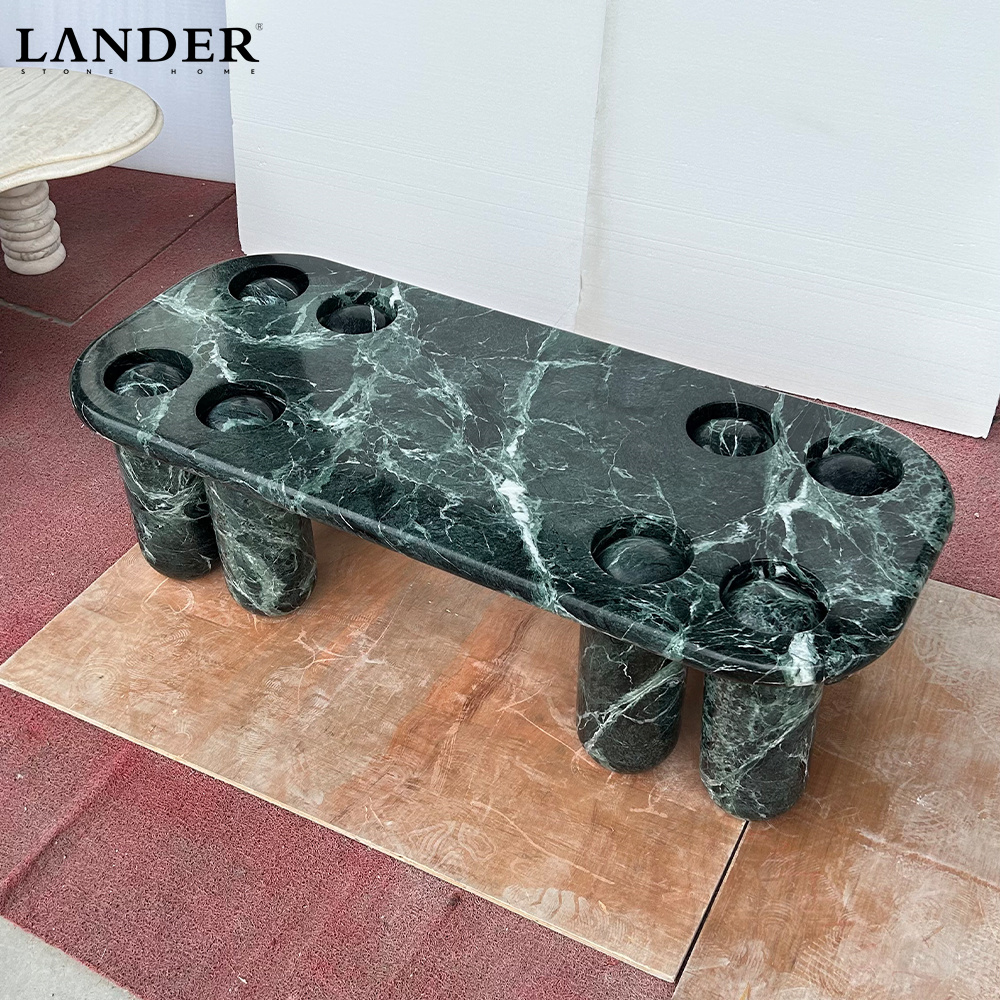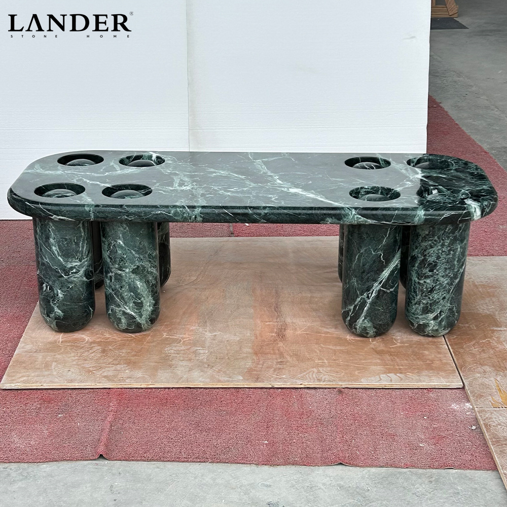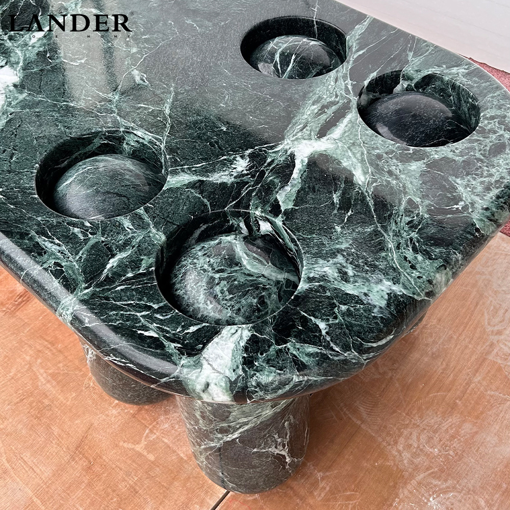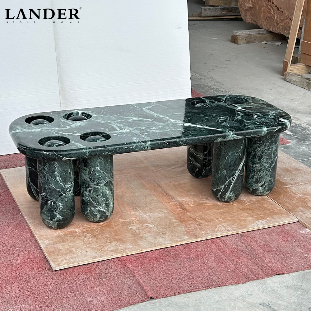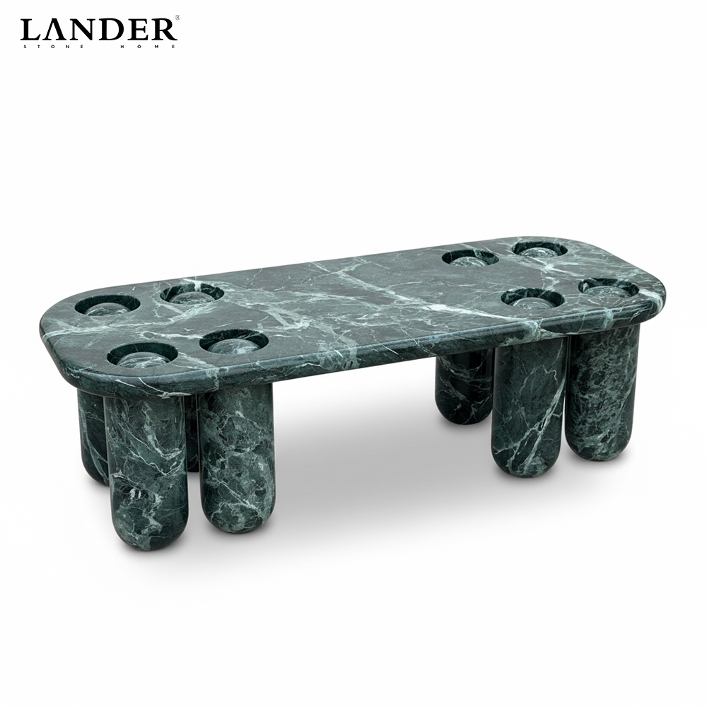 The Verde Alpi Marble Coffee Table showcases rich green Verde Alpi stone with dramatic white veining and subtle mineral highlights, creating an immediate focal point. Its low, sculptural profile sits on solid stone supports and is hand-honed to a smooth, tactile finish—offering both refined texture and reliable durability. Dense and heat-resistant, the marble top is built for everyday use while each piece’s natural patterning ensures a one-of-a-kind, gallery-worthy accent for modern, eclectic, or classic interiors.