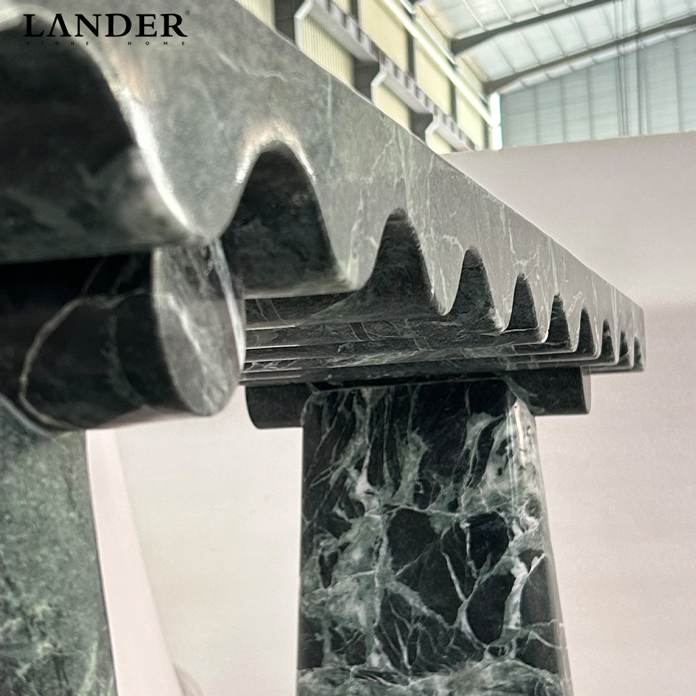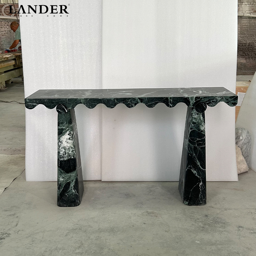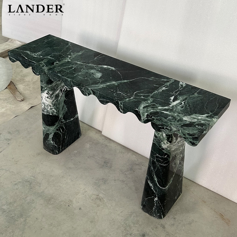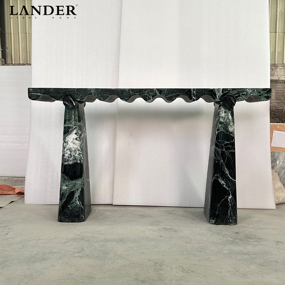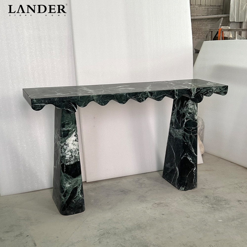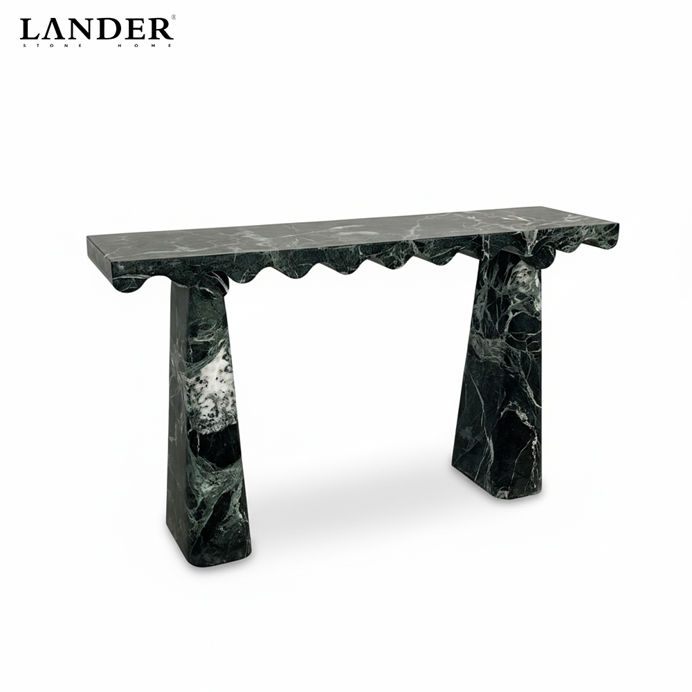 The Verde Alpi Marble Console Table with Wave Design brings a bold, contemporary aesthetic to any space. The rich green marble, featuring striking white and gold veining, creates a dynamic visual contrast. Its sleek, rectangular top is supported by a unique wave-inspired base, adding a fluid, sculptural quality to the design. Handcrafted with precision, the smooth, dense marble surface offers both durability and heat resistance, making it ideal for displaying art, lighting, or functional essentials. With its distinctive pattern and organic form, this table elevates entryways, living rooms, and gallery spaces with a touch of sophistication and artistic flair.