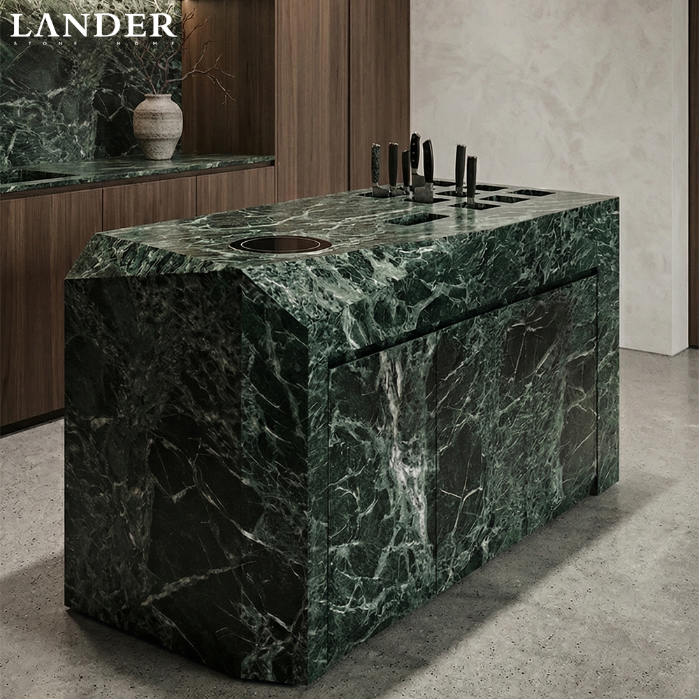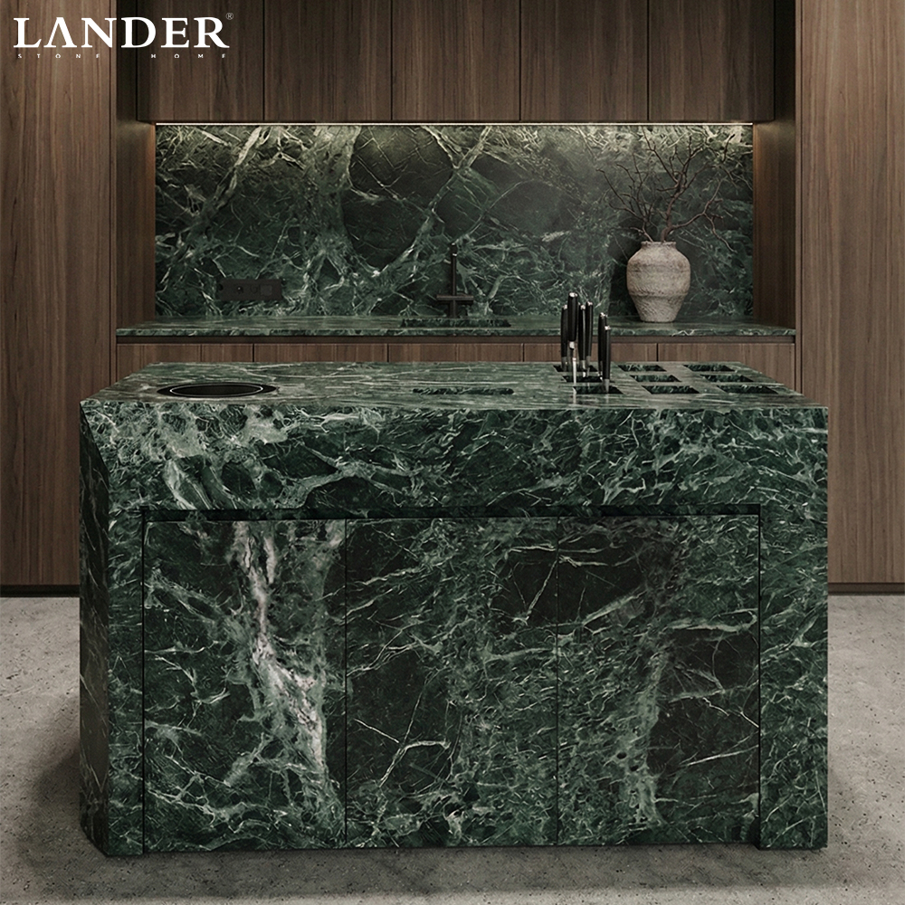 • Iconic Verde Alpi Marble: Showcases the rare and prestigious Italian dark green marble, renowned for its intense color depth and dramatic veining that makes every island a singular work of art.