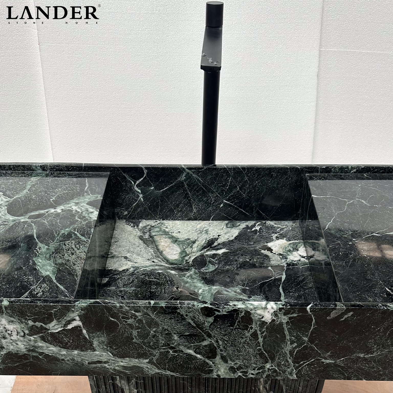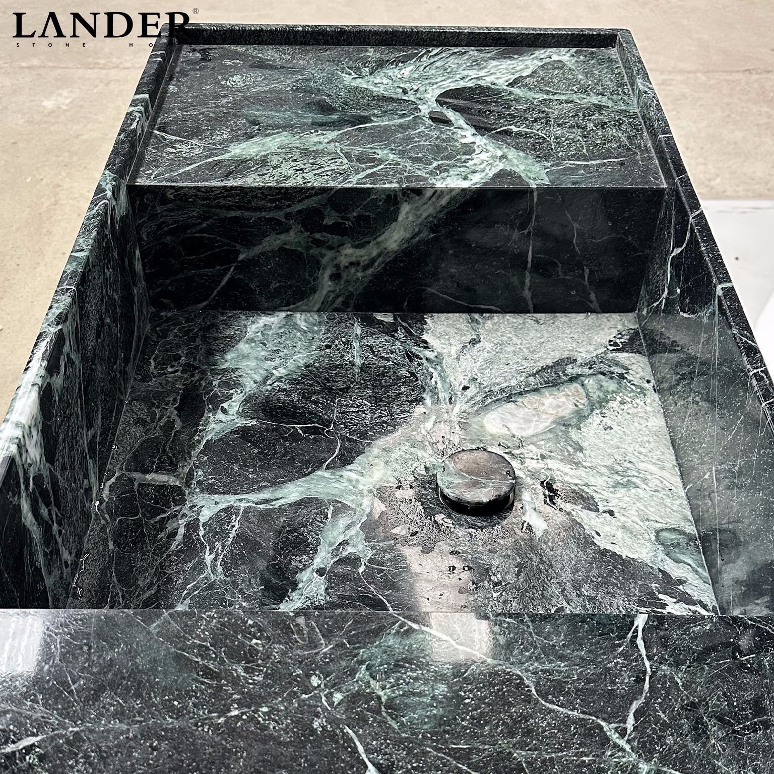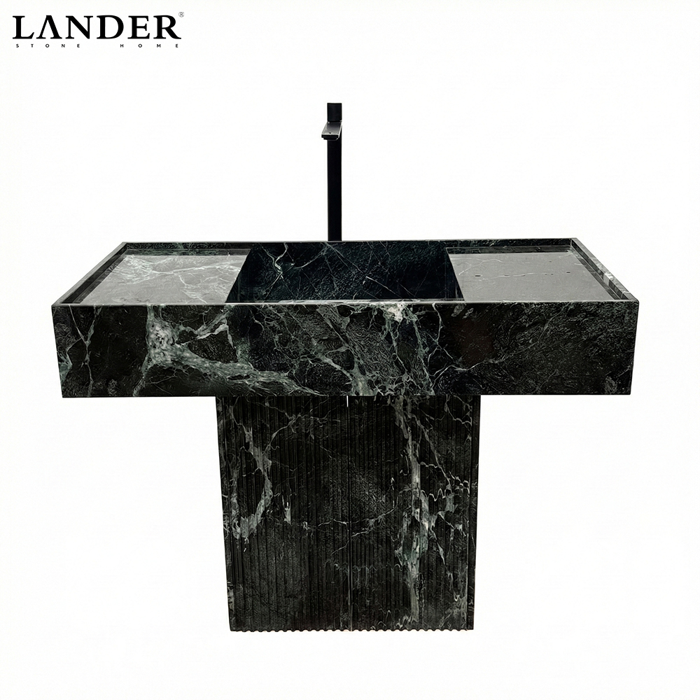 The Verde Alpi Marble Sink is a monumental statement of Italian-inspired luxury and architectural texture. Carved from premium Verde Alpi marble, it features a deep forest-green canvas with striking white crystalline veining.