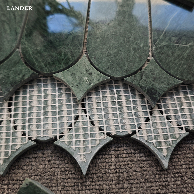 The Verde Guatemala Waterjet Marble Mosaic Tile features rich emerald-green tones with lively white veining, cut by precision waterjet for crisp geometry and seamless pattern flow. Mounted on mesh for easy installation, these premium marble pieces deliver durability, heat resistance, and timeless luxury when properly sealed. Ideal for statement walls, shower surrounds, floors, and backsplashes in high-end residential and boutique hospitality interiors.
