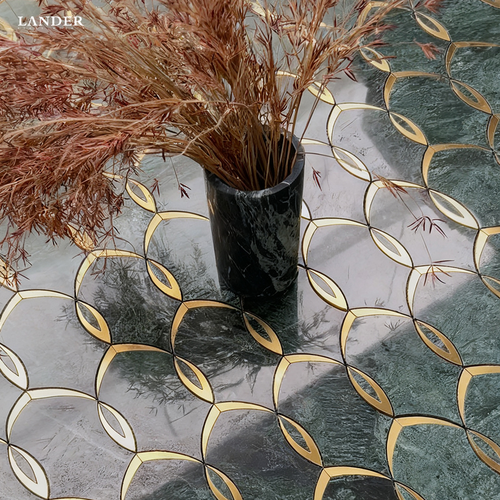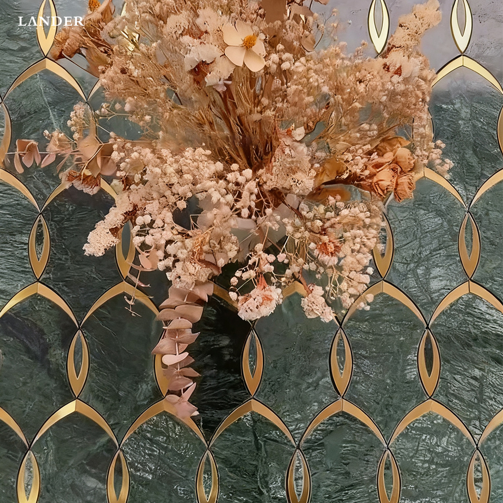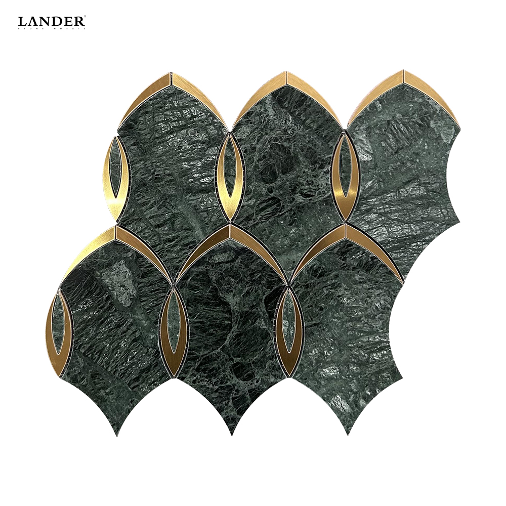 Verde Guatemala Waterjet Marble Mosaic Tiles combined with 304 stainless steel create a luxurious and modern design. This blend offers a sleek, durable surface, ideal for enhancing floors and walls with a sophisticated, polished look. Perfect for high-end interiors.
