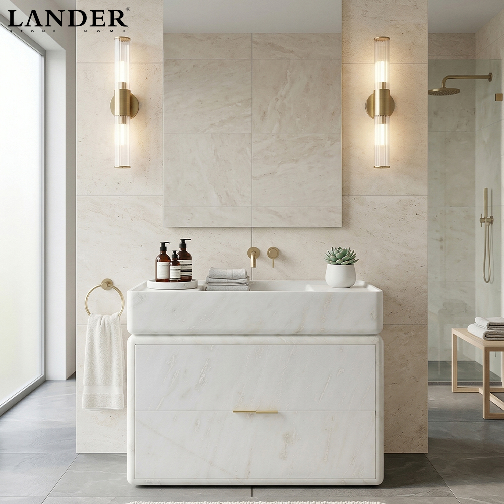Seamless Stone Integration: Combines a solid stone basin and matching cabinetry into one cohesive unit, accented by elegant gold hardware for a perfect balance of natural material and metallic luxury.