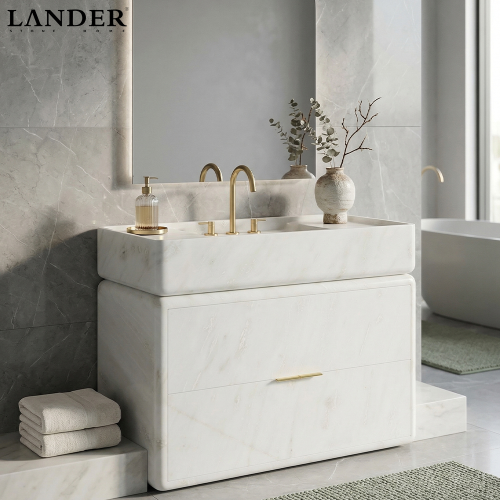 The White Jade Marble Bathroom Vanity Sink is the epitome of “Quiet Luxury,” bringing a sense of ethereal purity and soft, modern elegance to the bath. Expertly crafted from premium White Jade Marble, this vanity is distinguished by its luminous, milk-white surface and subtle, cloud-like veining that offers a semi-translucent glow under light. The design features a beautifully rounded rectangular silhouette with an integrated countertop sink and a matching stone-faced cabinet accented by a minimalist gold handle. Polished to a silky-smooth finish, the natural stone is both durable and moisture-resistant, making it a timeless centerpiece for high-end residential master suites, serene spa-inspired bathrooms, or boutique luxury hotels seeking a minimalist yet opulent aesthetic.