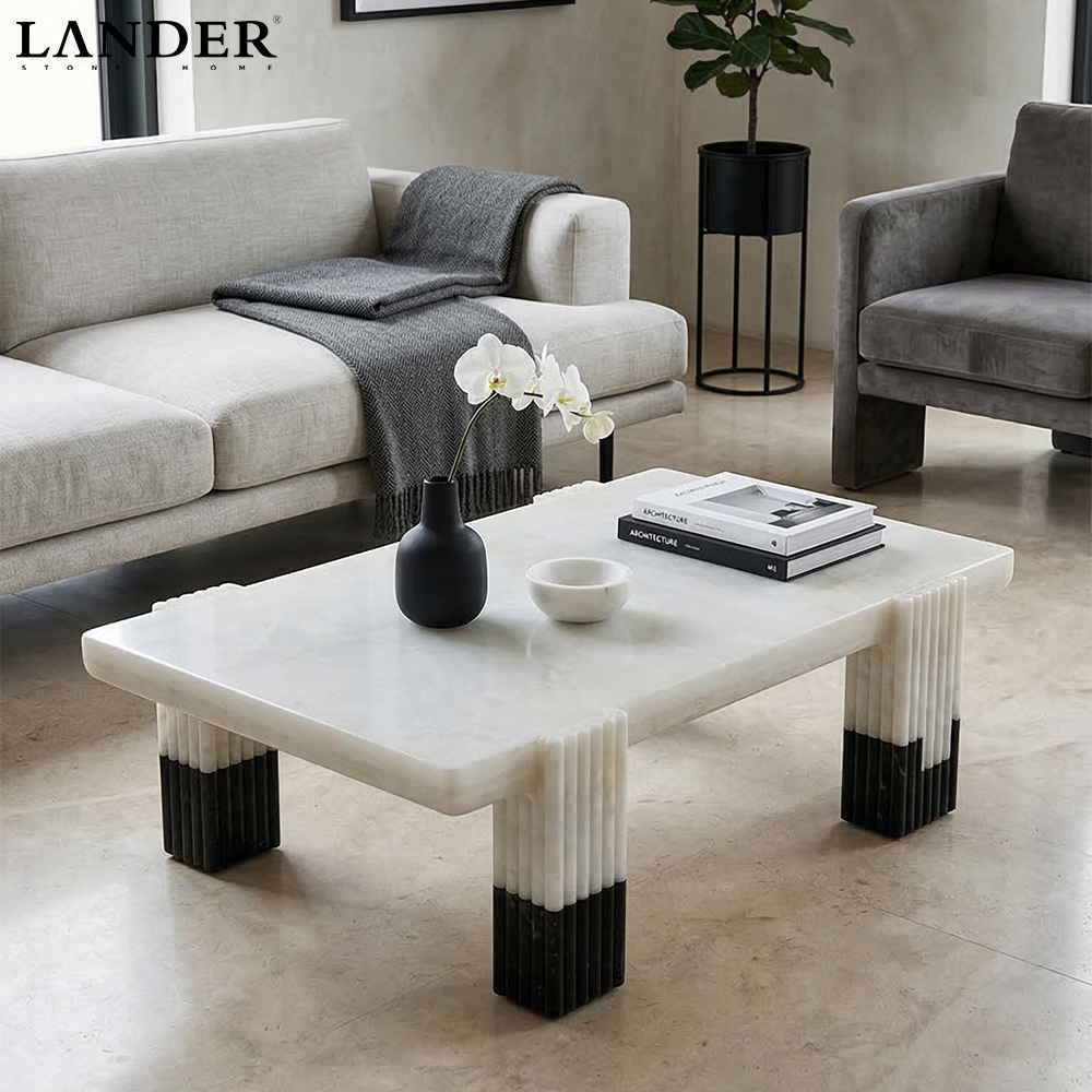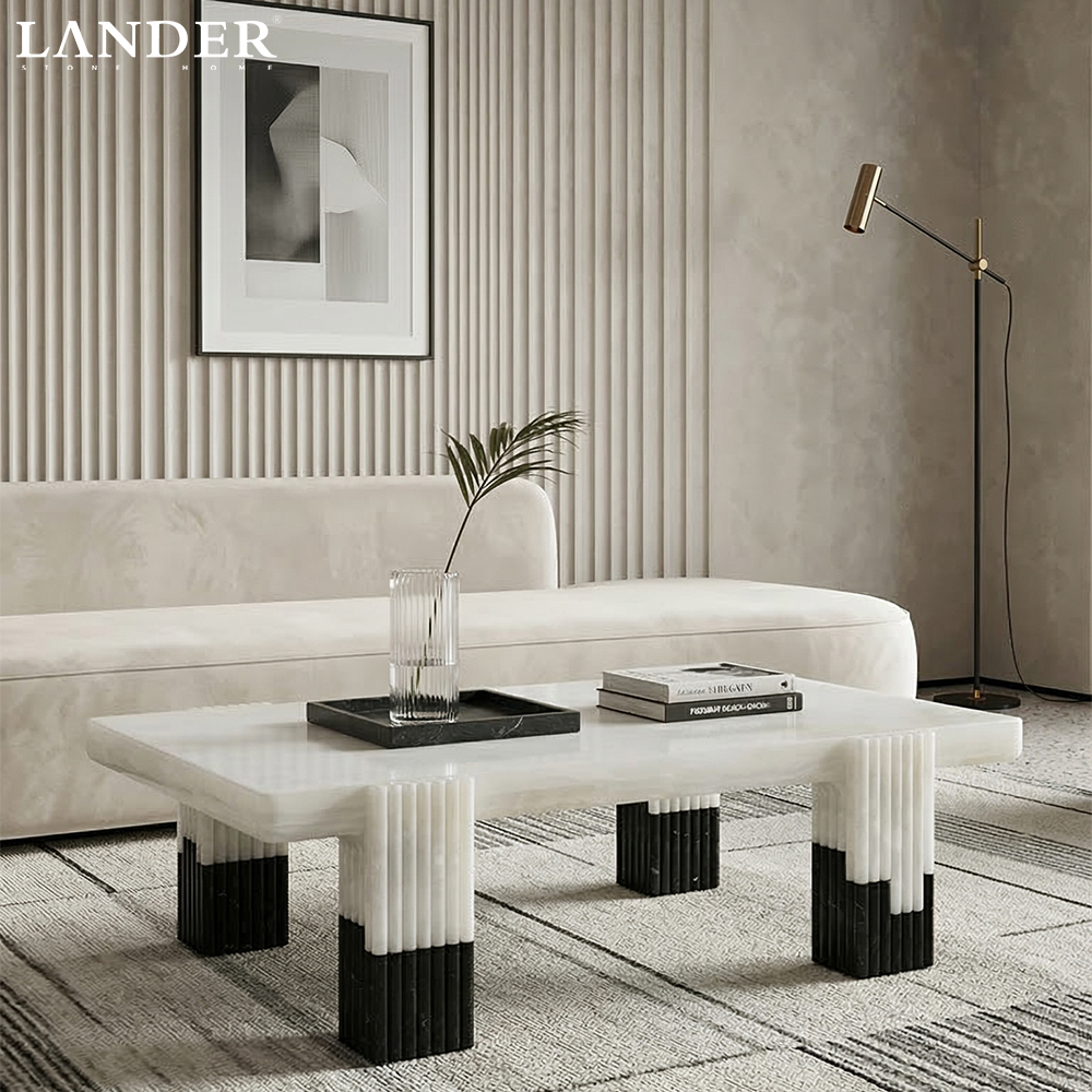 The White Onyx and Nero Marquina Marble Coffee Table is a sophisticated, high-contrast piece that elevates minimalist design through the use of luxurious materials. This statement table features a luminous, rectangular top crafted from pristine White Onyx, famous for its translucent quality and soft, ethereal glow. The substantial top is dramatically contrasted by its unique legs, which combine the dark, deep tone of Nero Marquina Marble with fluted white accents, creating a striking, Art Deco-inspired two-tone effect. This coffee table is an ideal focal point for contemporary, high-end living spaces, offering peerless durability and a refined visual balance between light and dark.