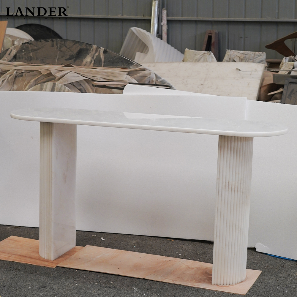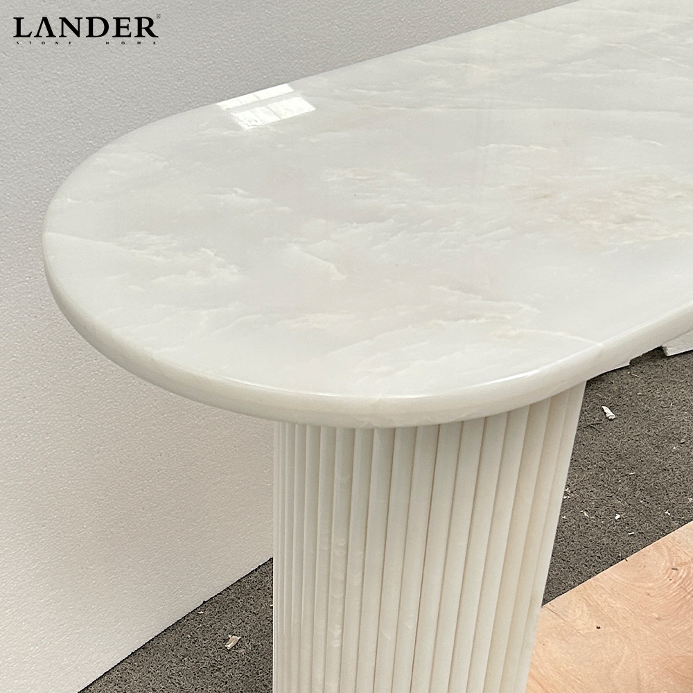 The White Onyx Oval Marble Console Table is a luminous masterpiece of minimalist luxury and classical texture. Expertly crafted from premium White Onyx, this console features a slender, elongated oval top that showcases a delicate dance of snowy white tones and ethereal, translucent veining. The design is elevated by two sophisticated half-moon pedestals—one finished in a smooth, honed surface and the other featuring precision-carved fluted grooves—creating a subtle yet captivating architectural contrast. Polished to a refined satin sheen, the stone’s natural clarity brings a sense of airy brightness and “quiet luxury” to any space. This slim-profile statement piece is the perfect addition to high-end foyers, luxury hallway galleries, or as a sophisticated accent in contemporary living rooms.