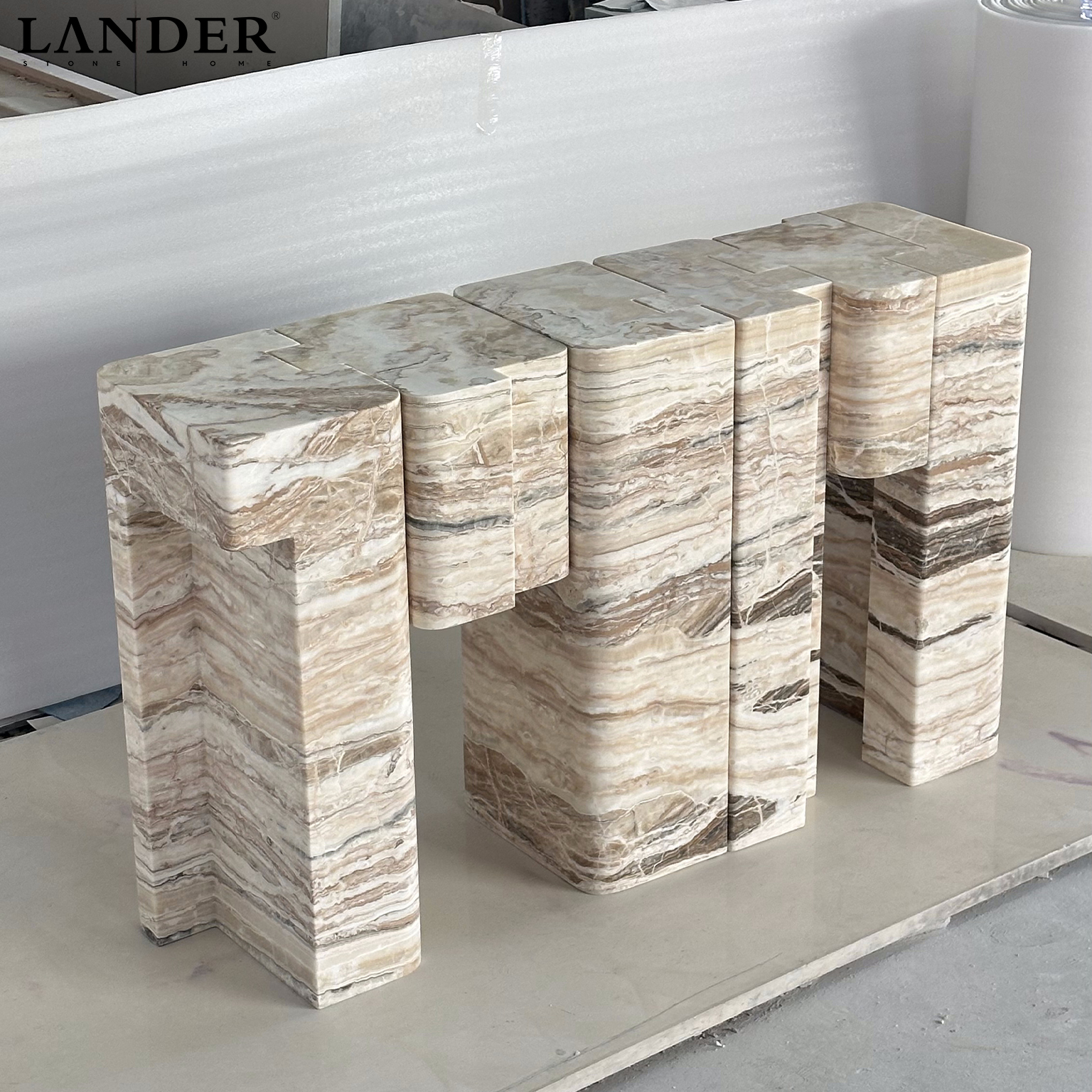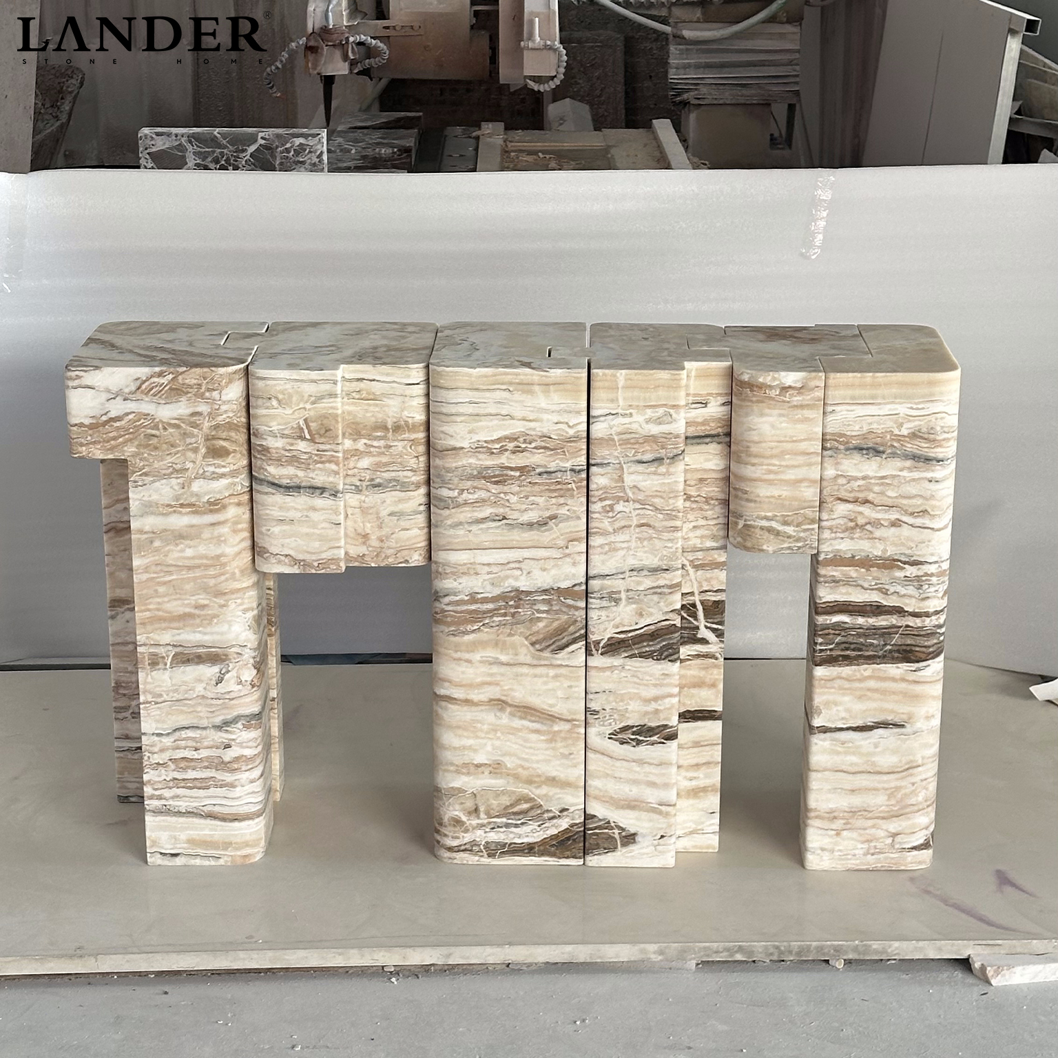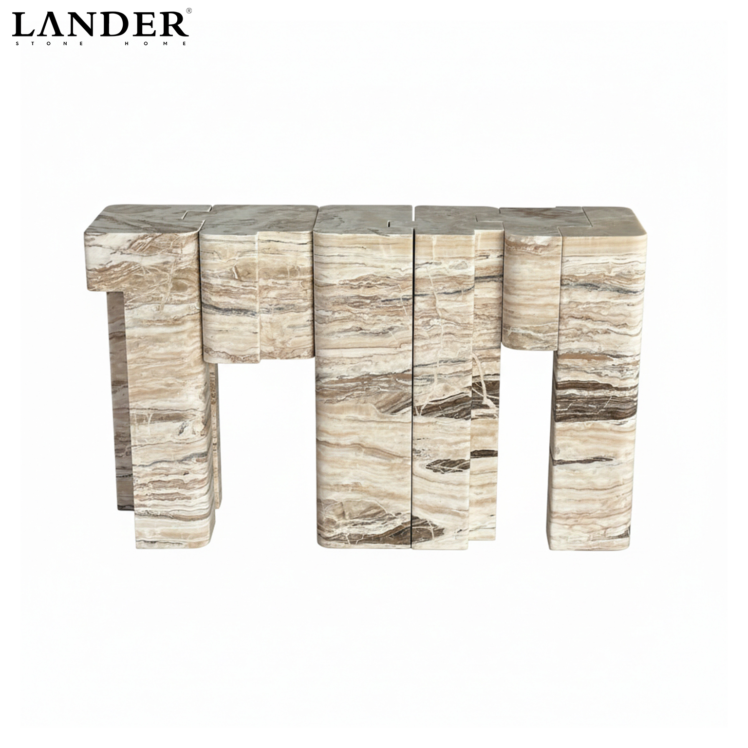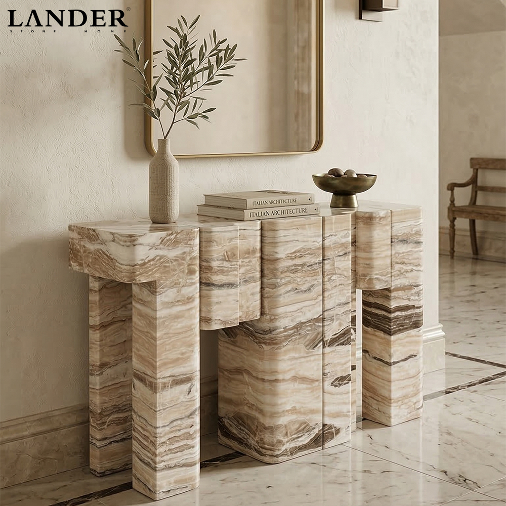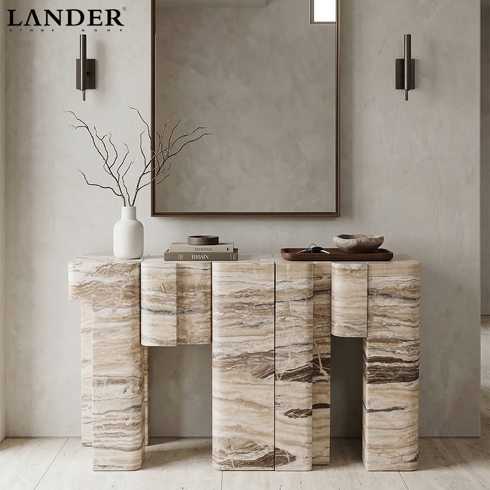 The Zebra Onyx Marble Console Table is a striking masterpiece of rhythmic texture and tectonic form. Expertly crafted from premium Zebra Onyx, this table showcases a mesmerizing landscape of high-contrast linear veining in earthy cream, cocoa, and slate tones.